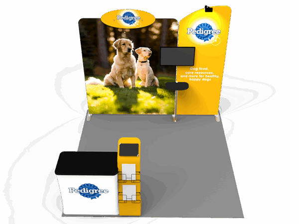 Also, it comes fully loaded with custom graphics & LED lights that all fit into a plastic hard case for transport to and from conventions & events. The plastic hard case also converts into fully functional podium, complete with a printed graphic for extra brand marketing.