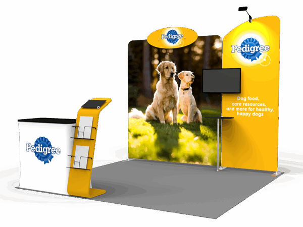 Amazing portable 10 x 10ft booth combination for trade shows! Our portable trade show displays are comprised of high-quality, tubular aluminum frames that snap together easily. This fantastic package has several incredible features, such as backdrop w/TV mount which is suitable for 22~42″ of LCD TV, a custom printed header, tablet PC display stand. The shelf unit is ideal for product displays or keyboard and mouse placement, so your prospective clients can have an interactive experience.