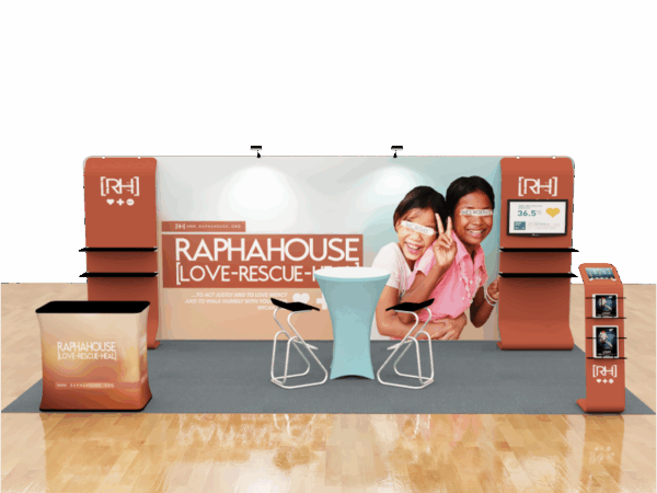 Our awesome 20ft portable trade show booth solution can draw attention to your brand! It allows you to fully customized your exhibit booth, just use all three panels in any onfiguration to form 10ft, 15ft or 20ft trade show display. Also, it comes fully loaded with custom graphics & LED lights that all fit into a plastic hard case for transport to and from conventions & events. The plastic hard case also converts into fully functional podium, complete with a printed graphic for extra brand marketing.