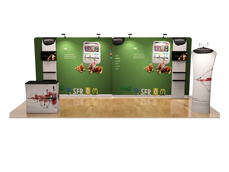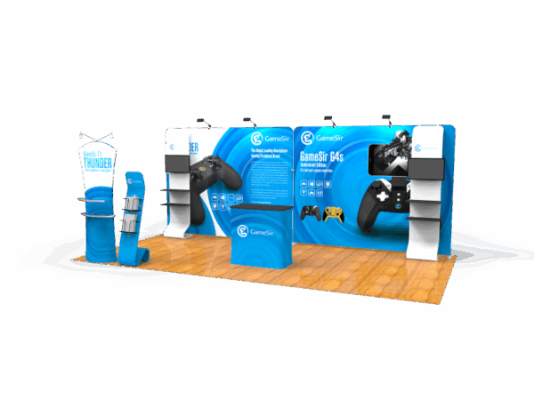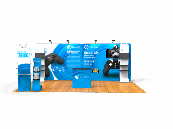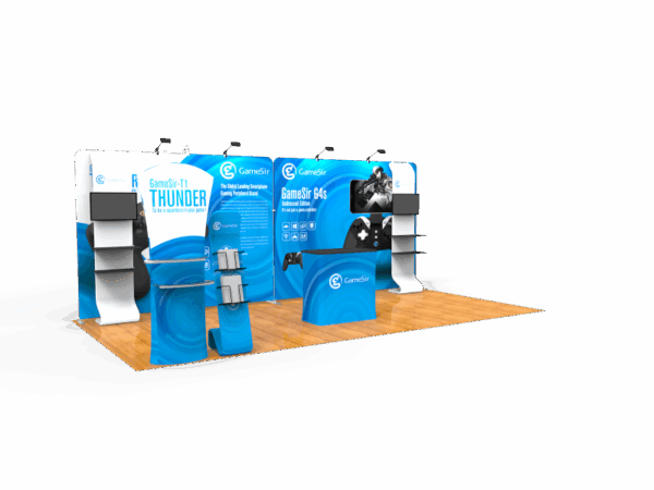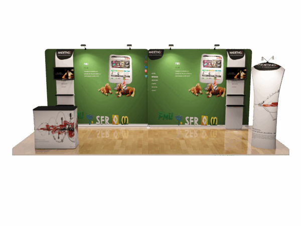 Our awesome 20ft portable trade show booth solution can draw attention to your brand! It allows you to fully customized your exhibit booth, just use all three panels in any onfiguration to form 10ft, 15ft or 20ft trade show display. Also, it comes fully loaded with custom graphics & LED lights that all fit into a plastic hard case for transport to and from conventions & events. The plastic hard case also converts into fully functional podium, complete with a printed graphic for extra brand marketing.