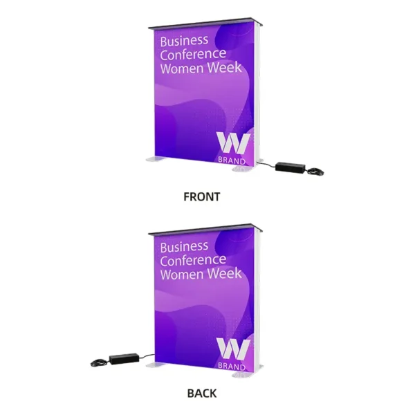 This Backlit Lightbox Counter is designed to help heighten your display experience. It is illuminated with LED edge lights that are reliable and energy efficient. Each kit includes:2 signle sided SEG dye sub backlit fabric graphics, 1 strong and durable aluminum frame, and bright LED lighting. And each kit comes with a travel bag for easy transportation and storage.
