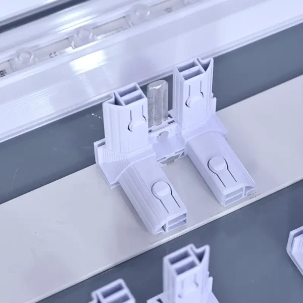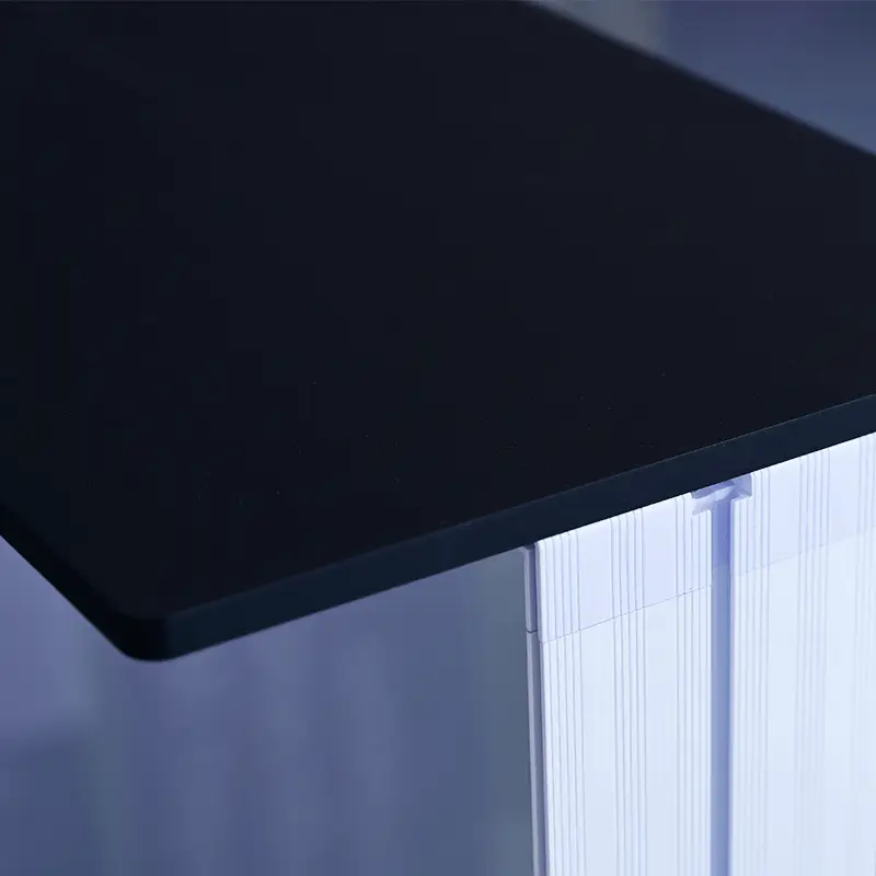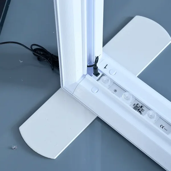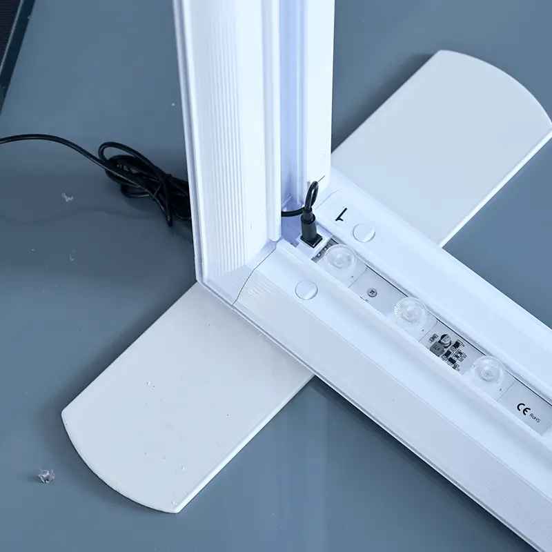The light box display counter has a low profile frame that appears frame-less from the front for a smooth edge to edge graphic display. The aluminum frame is easy to assemble, and the SEG backlit fabric graphics are easy to attach to the frame, just simply press the SEG straps into the grooves of the frame.
