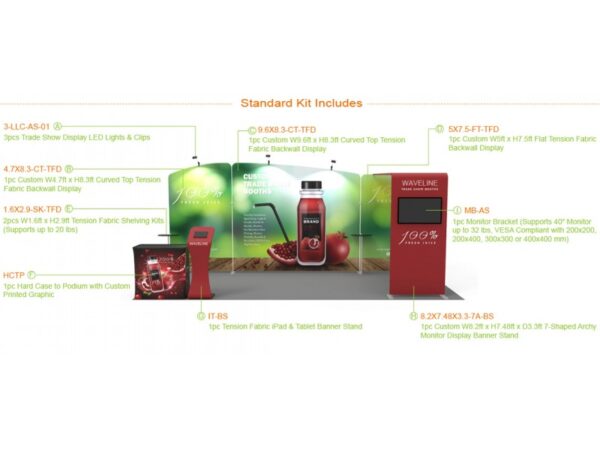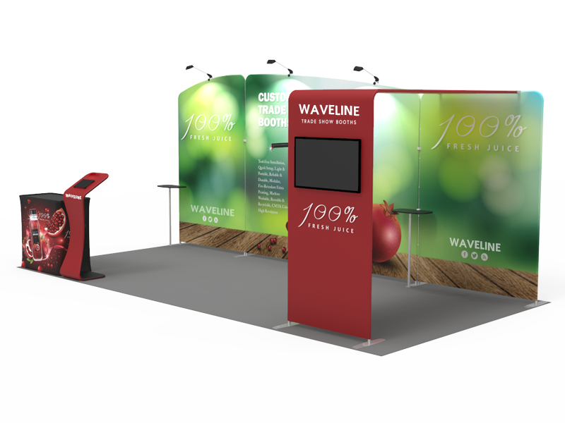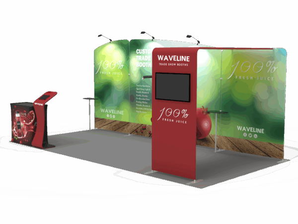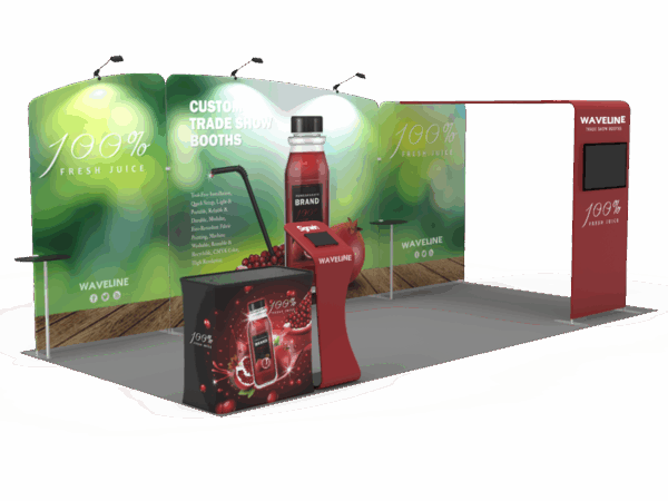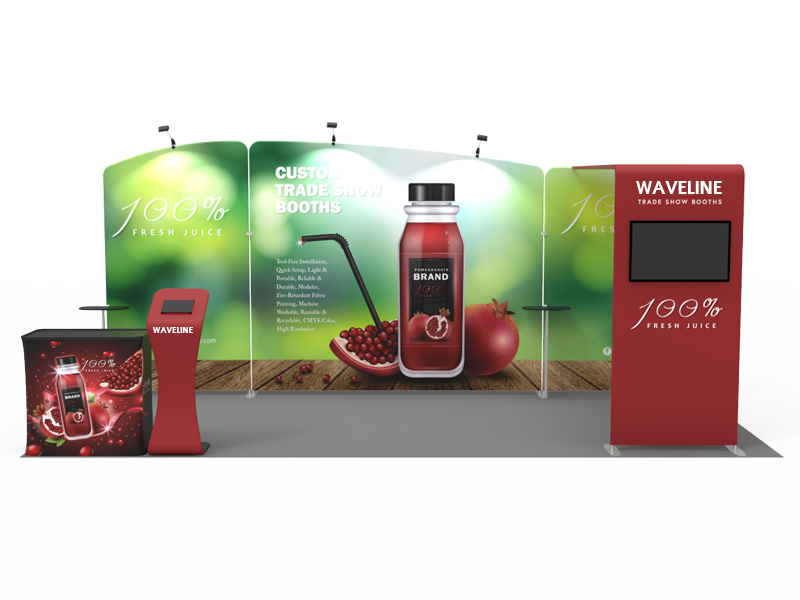 Our awesome 20ft portable tradeshow booth solution can draw attention to your brand! It allows you to fully custom your exhibit booth, just use all three panels in any configuration to form 10ft, 15ft or 20ft trade show display. Also, it comes fully loaded with custom graphics & LED lights that all fit into a plastic hard case for transport to and from conventions & events. The plastic hard case also converts into fully functional podium, complete with a printed graphic for extra brand marketing.